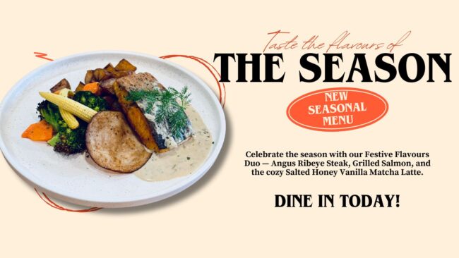 Festive Flavours Duo (Available Nov–Dec 2025) Celebrate the season with hearty bites and cozy sips — our Festive Flavours Duo is here for a limited time only! The Line-Up: Angus Ribeye Steak with Turkey Ham — Juicy ribeye served with buttered seasonal veggies, roasted potatoes, and our house-made herb butter. Grilled Salmon with Turkey Ham…