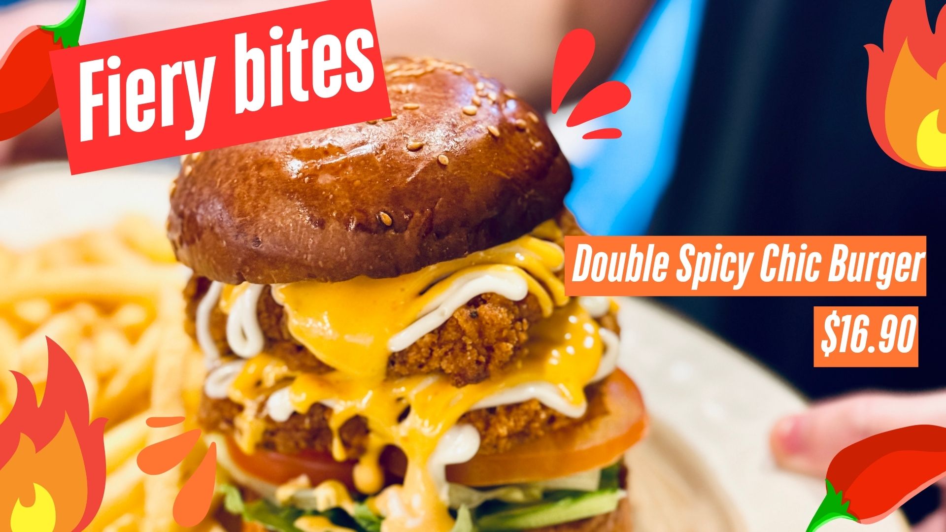 Enjoy a hearty burger featuring double crispy fried chicken topped with lettuce, tomatoes and spicy mayo, served with fries on the side. A satisfying choice for those who love bold, spicy flavours.